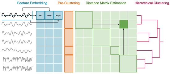 Clustering approaches that can handle time series of different lengths have longer runtimes and higher computational complexity than clustering algorithms for same-length time series. For this reason, our aim is to use a fast clustering algorithm, such as K-Means or Birch, for pre-clustering and to, in this way, support a slower but more accurate hierarchical clustering algorithm afterwards. Because these fast algorithms can handle only fixed-size data, we must first transform the time series in a fixed-size embedding space. For this transformation, JET collects a large number of features for every time series in the input dataset (Lines 3–6 in Algorithm 1). The features cover properties such as time series length, variance, mean etc., and model one dimension in the embedding space each. In this way, every time series has the same number of features, i.e., dimensions in the embedding space (see blue matrix in Figure 1). In this space, JET can calculate Euclidean distances and other distance metrics based on same-lengths inputs. To ensure the same weights for all features, our approach z-normalizes the features as a downstream step.