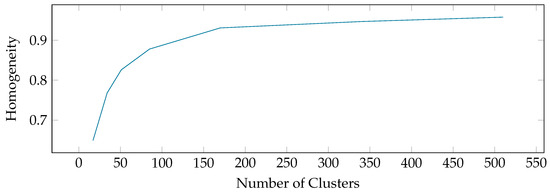 Our goal is to estimate large parts of the distance matrix with already pre-clustered groups using the centroids of these groups as surrogates for the distance calculations. For this, the distances of time series from different pre-clusters need to be as similar as possible to the distances of their respective cluster centroids. To ensure proper estimations, time series that belong to different clusters should also not be in the same pre-clusters. Thus, the homogeneity [33] of the pre-clustering should be very high. The homogeneity of clusters grows with an increasing number of clusters. The most extreme case is having as many clusters as data points and every data point being its own cluster. Then, we have a 100% homogeneity. On the flip side, having all data points, i.e., time series, in one cluster results in the lowest homogeneity. Figure 2 shows the increasing homogeneity with an increasing number of clusters that the Birch algorithm generates on a sample dataset.