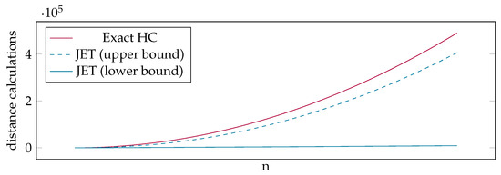 The most expensive task of an HC algorithm is the calculation of the distance matrix of all n data points, especially when clustering large time series. Its runtime grows quadratically with n. Because the distance matrix is mirrored on its diagonal, in practice, only about half of it must be calculated. Hence, the exact HC approach has a runtime of distance calculation for the distance matrix. Our approximating JET approach pre-clusters the n data points into groups, which provides a good trade-off between the number and size of groups. With a , there are as many groups as there are members on average, and it has the fewest distance calculations. With a higher number, we obtain more distance calculations, but can counter Birch’s bad quality even more. In the best case, Birch uniformly assigns each of these groups members. For each group, we then have to calculate distances, which results in a total of distances. The calculation of the centroids’ distances for the full distance matrix requires another calculations, because we have groups. Hence, the total number of distance calculations is . Compared to the exact approach, this is a speedup of . However, this is the best case scenario. In most cases, the pre-clustering does not uniformly assign the data points to groups. In the worst (but unlikely) case, JET assigns only one data point to groups each and the rest of the points to one group. Then, the number of distance calculations would be . Still, this would be a speedup of , which is close to but still better than the exact HC’s runtime. Figure 3 visualizes the number of distance calculations for different numbers of data points n and the theoretical potential of our new approach. In Section 6, we report actual runtime measurements on different benchmark datasets.