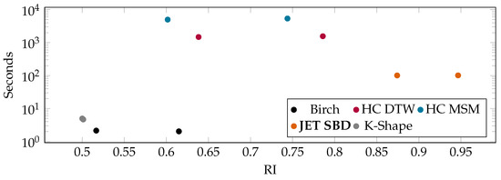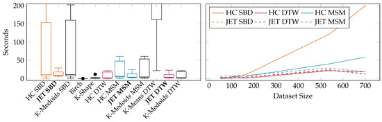 K-Means with DTW is, as shown in Figure 5 (left), the slowest among all the algorithms. This might, however, be due to the implementation details of the K-Means tslearn [36] implementation, which can handle time series data with varying lengths better than other libraries, because the very similar K-Medoids algorithms perform much better here. The runtime is still so much worse than all other runtimes that the implementation details alone cannot explain it. Figure 5 (left) shows that calculating an exact and complete SBD distance matrix also takes a long time. Both HC with SBD and K-Medoids with SBD rely on a full distance matrix. Hence, their runtimes are the longest runtimes of all algorithms. JET with SBD only approximates certain parts of the distance matrix (with the cluster centroids) and is therefore significantly faster than all HC variants, especially with SBD. Birch is the fastest algorithm, followed by K-Shape. Both of these super-fast algorithms do, however, perform worse than JET in terms of RI score on varying-length time series. JET is among the fastest clustering approaches in the experiment and can therefore meet practical execution time limits.