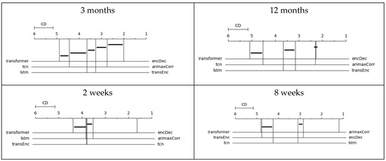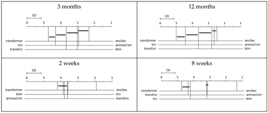 CD diagram of the mean absolute error. Note: transformer = transformer, tcn = Temporal Convolutional Network, lstm = long short-term memory, encDec = LSTM encoder–decoder, arimaxCorr = SARIMAX, transEnc = encoder transformer.