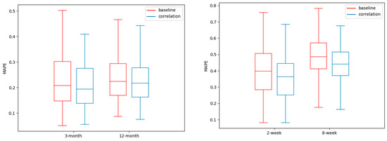 In Figure 3, it is possible to analyze the performance metrics between regions and at the same time show the contribution of the spatial–temporal correlation. The box plots of this figure show the average MAPE for the 82 regions of the LSTM encoder–decoder that includes the spatial–temporal correlation and a baseline LSTM encoder–decoder that does not include the spatial–temporal correlation. We can obtain two main findings from these graphs. First, the incorporation of the spatial–temporal correlation, as we conducted, improves the performance, because the box plots tend to show lower MAPE values for the monthly and weekly predictions. The second finding is the high variability in the error prediction between regions, regardless of the spatial–temporal correlation. For example, for the forecasting of three months, the MAPE varies from 0.05 to more than 0.4. There are regions with acceptable values of the MAPE and others with high values, for any of the forecasting horizons.