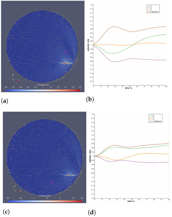 Comparison of fluid velocity development throughout a simulation. The simulation setup and the points of measurement (magenta) are shown in (a,c). The associated velocity developments over time at the respective locations are shown in (b,d).