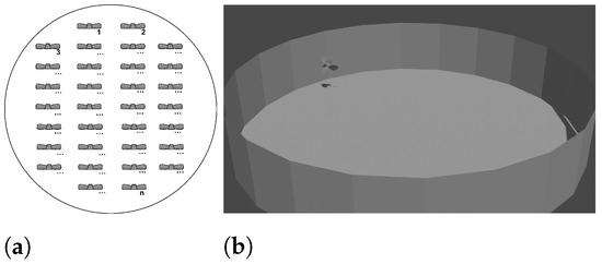 Figure 2a schematically illustrates the multiple strategic placements of the rotor considered for the simulation cases within the biogas reactor. The rotor positions, indicated by numbers for each separate simulation case, were varied systematically across multiple simulation cases to assess their impact on mixing efficiency. The consistent representation of the rotor design across all simulations ensured comparability and validity of the results. Figure 2b shows a single simulation case of one batch with a minimal rotor setup and removed top lid.