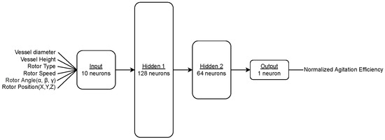 Fully connected neural network model architecture used in this work. The input layer consists of 10 neurons, followed by two hidden layers with 128 and 64 neurons, respectively, before outputting on one single neuron on the output layer, which describes the estimated Normalized Agitation Efficiency. The Adam optimizer is used, and the activation function of each layer is a Rectified Linear Unit (ReLU), except for the output layer, which has linear activation.