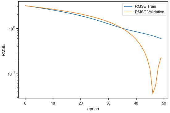 Figure 4 shows the losses of the presented model throughout the training step. After around 35 epochs of training, the models showed signs of overtraining, with the RMSE of the test set dipping way below the performance of the training data, before rapidly recovering. The root cause of this is likely the limited number of training data provided.