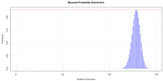 - Compute critical values () for the binomial distribution associated with the ELM outcomes. These critical values indicate the minimum number of successes within the specified interval (25th percentile). In essence, the binomial distribution function is used to derive these values and the results are stored in a vector that is scanned for the identification of the index corresponding to the integer number of successes closest to the pre-selected significance level. This number is then subtracted from the total number of bootstrap replicates to obtain the threshold for the definition of the null hypothesis. This information is used to indicate the minimum number of successes within the confidence interval to fail to reject the null hypothesis.