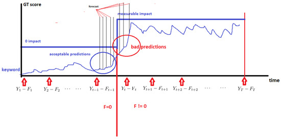 The examples given below are associated with specific keywords (reported in the plots) sampled at an 8-minute frequency (time span = 24 h) and 1 day. In the captions, brief explanations, relevant to the current analysis, are provided. Essentially, these plots show that fake news can be identified when an incoherent pattern in the predictions delivered by the tested models is detected (see Figure 2).