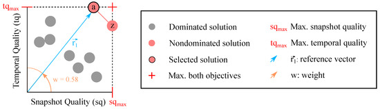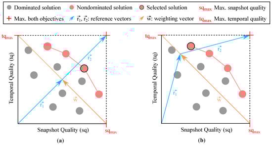 Our weighting system is illustrated in Figure 1. Here, in both subfigures, the x-axis indicates values of snapshot quality, where is the maximum possible value for the chosen metric. The y-axis denotes temporal quality values, with representing the maximum. The grey circles are dominant solutions, and the pink circles form the Pareto front. The black outlined circle highlights the selected solution from the Pareto front. The segments are represented through two vectors, and , which are further denoted as reference vectors (highlighted in blue). is the weighting vector, which determines the position of the terminal point of and the initial point of . The weight, , indicates the length of relative to its maximum possible length.