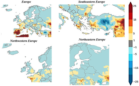 The weekly time series plots comparing Fire Weather Index (FWI) anomalies in 2022 with the reference period mean have provided valuable insights into the temporal patterns of fire danger across various European regions—Europe, Southwestern Europe, Northwestern Europe, Southeastern Europe, and Northeastern Europe. The x-axis represents weeks, showcasing mean FWI values, while shaded regions indicate the reference period’s FWI variability. A solid line denotes the reference period mean, and shaded areas above and below represent the 10th to 90th percentile range and the minimum to maximum range during the reference period. These analyses identified specific weeks and regions susceptible to heightened fire risk and those exhibiting a reduced risk. Regions highlighted in red on the plots indicated an excess of FWI values in 2022 compared to the reference period mean, signifying heightened fire danger during those specific weeks. On the other hand, regions depicted in blue exhibited FWI values below the reference period mean, suggesting a relative reduction in fire danger during those weeks. The dynamic perspective offered by these weekly analyses enhances our ability to pinpoint temporal variations in fire risk, supporting proactive measures and emphasizing the importance of region-specific wildfire management strategies. Source: own elaboration based on Section 3.
