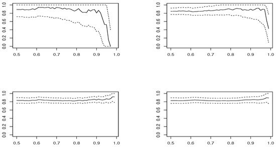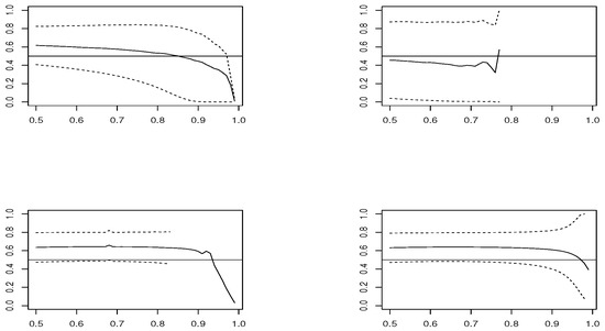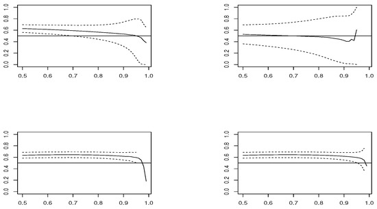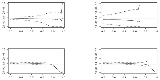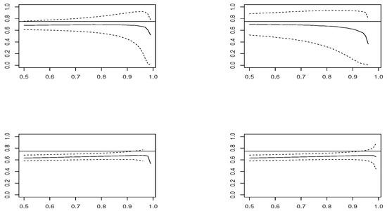 Estimated sample means (solid line) for each threshold u, in samples of size , along with Wald 95% confidence interval (dashed line), in model AMH where (horizontal line), of (top-left), (top-right), (bottom-left) and (bottom-right).