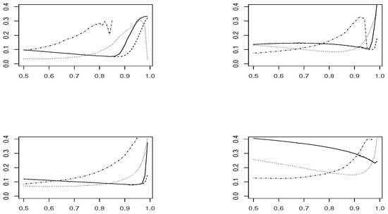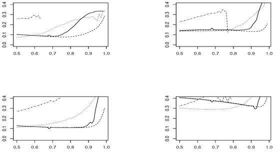 Estimated RMSE for each threshold u, in samples of size , for models (dotted line), (dot-dash line), (solid line) and (dashed line), for models AMH (top-left), Frank (top-right), BNormal (bottom-left) and Logistic (bottom-right).