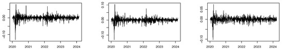 We are going to analyze the tail dependence between two stock market indexes pairs, CAC40–DAX and CAC40–PSI20, from January 2020 to February 2024, available from https://finance.yahoo.com/world-indices/ (accessed on 1 March 2024). We consider the daily close log-returns of each index, plotted in Figure 11. In order to remove heteroskedasticity, we apply an asymmetric GARCH filter. The scatter-plot in Figure 12 represents the 1037 pairs of residuals, where the association between the variables is evident, both in the central part and in the tail. The estimates of are plotted in Figure 13 and Figure 14. The value seems plausible for the CAC40–DAX pair, particularly in estimators and , leading to a diagnostic of tail dependence. Regarding CAC40–PSI20, the estimate is pointed out to be , meaning asymptotic tail independence. Therefore, the risk of contagion for the occurrence of extreme values is higher between the CAC40 and DAX indices, when compared with the CAC40–PSI20 pair.