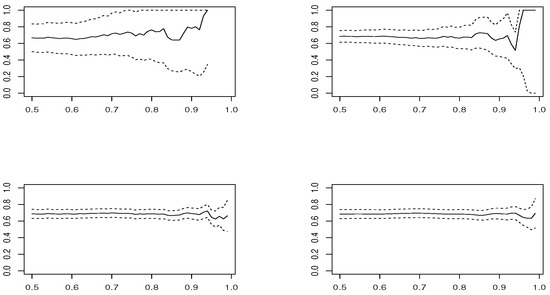 CAC40–DAX: Estimates given by (top-left), (top-right), (bottom-left) and (bottom-right) for thresholds u between 0.5 and 0.99 and respective 95% Wald confidence intervals.