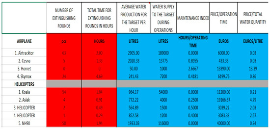 This study employed the computational functionalities of Microsoft Excel 2016 to construct formulas that compute various metrics based on input numerical values. These calculations include the operational costs of each aircraft type, incorporating both the transfer flight and the actual firefighting efforts; the hourly water production capacity from a water source at a predetermined distance for each aircraft; and a comparative analysis of these factors. The objective of the simulation was to analyze the cost differential between a firefighting aircraft and a helicopter, juxtaposing this with the relative firefighting efficacy. Furthermore, the research examined the impact of utilizing two distinct water intake locations (one optimized for helicopters and the other for fixed-wing firefighting aircraft) on the volume of extinguishing water delivered by different aircraft types and the cost per liter of water derived.