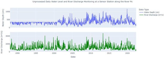 This section presents the datasets and a concise analysis, followed by an explanation of the methodology. Conducting data analysis, we focused on two pivotal time series datasets—water depth and water discharge—gathered from strategically positioned sensor stations spanning multiple years. The ensuing discussion outlines the intricate analytical procedures and frameworks applied to extract meaningful insights into the hydrological dynamics under investigation. The water depth time series delineates variations in depth, enabling an assessment of riverbed topography changes at specified sample stations. Concurrently, the water discharge time series, derived from additional river stations, provides insights into flow dynamics influenced by precipitation, snowmelt, and other hydrological factors. Employing descriptive statistics and visualization techniques, the objective is to uncover patterns and correlations within these datasets, contributing to a nuanced forecast of river navigability. The analysis is rooted in meticulously collected daily measurements from two distinct critical section stations, each representing unique segments. The dataset spans from 1 January 1988 to 12 May 2022, comprising 12,294 and 12,255 records for the respective stations. Recorded at daily intervals, the time series data underwent careful handling of missing values using the forward fill method to ensure data consistency. The time series of water discharge and water depth are represented Figure 4 and the main indicators of a descriptive analysis are reported in Table 1.