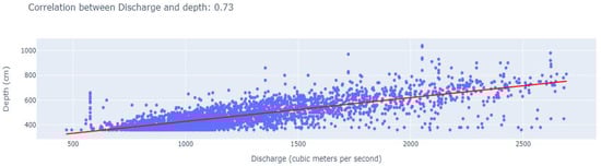 Observations revealed that the average depth and discharge spanning the years were 333 cm and 950 m3/s, respectively, at a station. The correlation between depth and discharge attributes was notably high at 0.73, indicating a strong interdependence in hydrological relations (see Figure 5 and Figure 6).