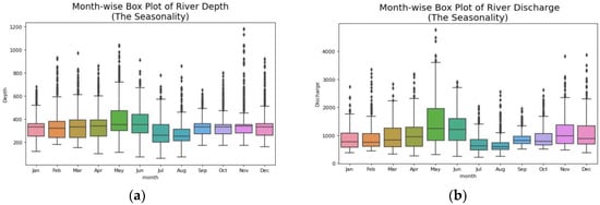 Monthly Box Plots (2021) illustrating the distribution and variability of river depth (a) and discharge (b) at the station.