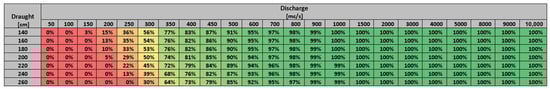 Figure 9 shows examples of navigability risks for the vessel classes (based on draught) given the discharge classes. The probability was computed based on the percentage of occurrences of the event water depth > minimum draught in the historical data. The navigability risk of a stretch is provided as the worst navigability risk value among those obtained for each critical section of the stretch. On the one side, this approach uses a huge amount of data and can define a good statistical correlation between discharges and critical sections for water depth in terms of overall performance.