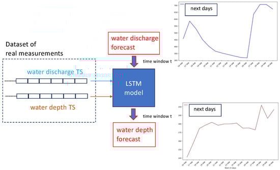 The Long-Short-Term (LSTM) neural network [3] has been selected to generate the models. Indeed, it is well known that the LSTM is effective for modeling and predicting sequences, given its ability to retain information over extended periods. Other more recent methods, like Transformer models [4], are also employed for numerical time series analysis, but as they are especially effective in handling sequential data with complex dependencies (e.g., many variables or global dependencies), they were not the first choice for these experiments. Furthermore, recent works such as [5,6] have demonstrated that for river water level prediction, LSTM models trained on water depth measurements and time series alone may outperform other artificial neural network architectures that correlate weather data (e.g., temperature and humidity) with water level observations. This may be because the river’s water discharge prediction at some locations is the result of a much more complex analysis that also considers non-local hydrological and climatic aspects. Figure 10 illustrates the problem statement of the LSTM method.