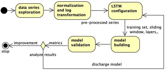 The TensorFlow Python implementation of LSTM has been used to build the code for training and testing the models. As it is common practice for this type of software development, the best LSTM configuration has been decided empirically. The development process of the models is an iteration over the quality of the predictions on the validation data by using various metrics, including accuracy (ACC score function) and f1. The general process followed is illustrated in Figure 11.