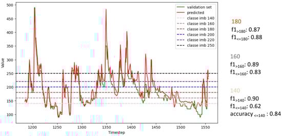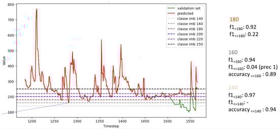 Figure 12 shows the vessel drafts and the f1 and accuracy values for the 140, 160, and 180 cm classes. These lowest classes are the most critical for the confidence level of the predictions for non-navigability, as these predictions overestimate much of the real values and provide wrong negative estimates for the last 100 days (from February to May 2022). Indeed, from the analysis of the considered dataset, in this period, a similar decrease pattern in water depth was not present beforehand. Expert knowledge of the management of the infrastructure and/or a deeper investigation into weather and environmental aspects may help to better interpret these results.