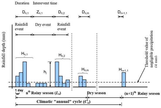 According to Figure 2, during any rainy season, the duration of any rainfall event will be denoted Dn,m and that of a dry event Zn,m. The cumulative rainfall amounts corresponding to this rainfall event will be calculated as follows (Equation (3)):