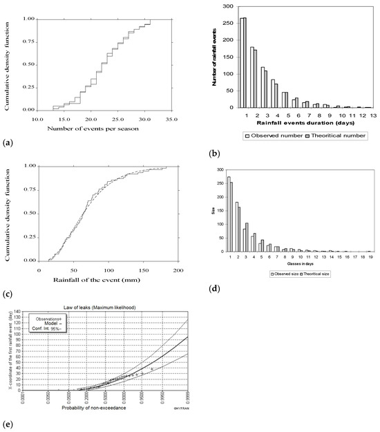 The best fit of the X-axis of the first rainfall event in the time axis (see Figure 2) is a law of the leaks (Figure 3e), using the HYFRAN software version 1.1 [6]. On average, the first rainfall event occurs in mid-September, while the probability of exceeding this value is 0.52 for a biennial return period. In the extreme case, the hydrological year begins around the first decade of October.