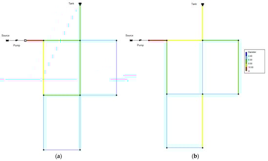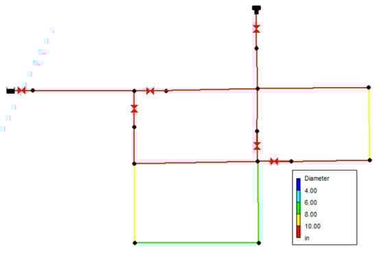 The sample network of EPANET, Net1, is used to demonstrate the quality of the methods. Some isolation valves have been added to generate segments and shutdown plans (Figure 1). Overall, six isolation valves create five segments. The cost of the original network is EUR 2.46 million. Figure 2 presents the results of the optimisations, both the traditional (left side) and the backup ones (right side). The costs of both cases are significantly lower than the original. The traditional optimisation cost EUR 1.11 million, while the backup optimisation cost EUR 1.49 million.