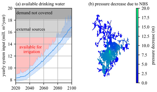 (a) Available drinking water for irrigation based on the results of Oberascher, Maussner, Truppe, Eggeling, and Sitzenfrei [5] and (b) pressure decrease in the water distribution network using only drinking water for irrigation for an implementation degree of 20%.