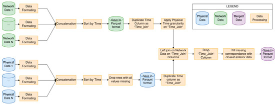 The combination process requires both the physical data and the network traffic data to obtain the time of acquisition, and these must be acquired during the same timeframe. As observed in CPS open datasets in the water distribution field, the physical data’s acquisition frequency is lower than that of the network data, usually with an acquisition each second versus acquisition at the millisecond scale for network data. To allow for the conjoint use of these data, a synchronization process is required, consisting of concatenating the most recent anterior physical data to each network data entry. The complete combination pipeline for static data is shown in Figure 1. The first step for both data types accounts for cases when the data are separated into multiple files. This step results in all network data as one file, and all physical data as another file, from which we remove lines with only missing values. The next step creates a common time column with an identical granularity for both files, corresponding to the physical data’s time granularity. This allows for a left join of the physical data onto the network data, based on this common time column that has just been created. This column is then removed, and the eventual network data that do not have physical data corresponding to their acquisition time are treated by filling with the most recent anterior physical data.