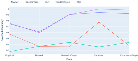 The detection performance, using a balanced accuracy metric for each model on the different data configurations, is shown in Figure 2. The best results are obtained with the XGBoost algorithm on the combined data with 99.84% balanced accuracy. Table 1 shows that the addition of graph metrics to network data greatly improved the detection performances of Physical Fault and MITM, respectively, from 0% to 77% and from 1% to 88% of the True Positive Rate. However, it led to a decrease of 8.70% TPR in the detection of the Scan label on combined data. A possible explanation is that the addition of graph data adds less qualitative information for the detection of this specific label than the network data alone, thus diluting the useful information and resulting in a harder detection task. The overall improvement of detection performances also reflects on the False Positive Rate, as shown in Table 2, which is especially relevant in attack detection where false alarms have costs in terms of time and resources spent on irrelevant investigations, as well as the impact on personnel through the effect of alarm fatigue [5].