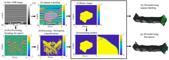 Pre-processing—classification. Taking advantage of the space-breaking process, a perceptron neural network [4,8] (Figure 1f) is employed to clean the GPR data further. This step is essential for noise reduction and precise labelling, leading to clearer images for in-depth analysis [7,8]. Building upon the perceptron’s foundation, in this work, additional inputs as range (ηs/total samples) and dimension () of the GPR image are applied (Perceptron 2) to refine and generate new interpretation perspectives.