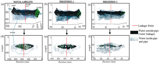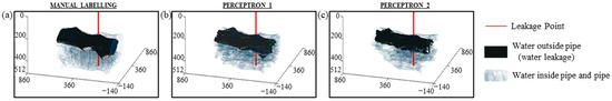 In Figure 2, the presence of leaking water is depicted in blue, encircling the pipe in all three of the proposed processes both in the 3D images and in the cross-sections. The result shows successful similarity between what is expected (Figure 2a) and what is predicted by Perceptron 1 (Figure 2b) and Perceptron 2 (Figure 2c). In Figure 2e, there are some gaps (compared to Figure 2d) that are due to the horizontal lines in the initial classification. In addition, it can be seen that Perceptron 2 focused its efforts on identifying the first reflection hyperbola. Therefore, we can see that only the top section of the pipe was generated (comparing Figure 2a with Figure 2e).