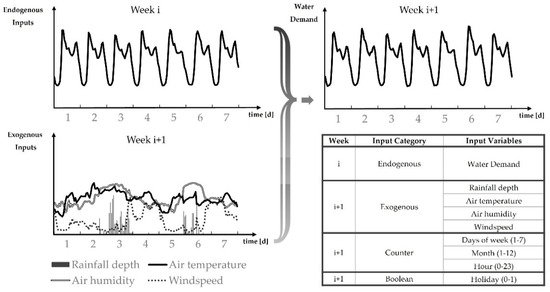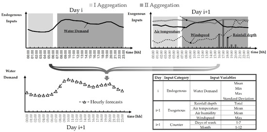 In addition, aggregating the input data for several hours in a day improved the deterministic forecasts. More precisely, the solution required accumulating the hourly data into two inputs to distinguish the night water demand (0:00–6:00) from the diurnal one (7:00–23:00). The aggregation in time reduced the number of the input data of each run: 8 statistics of the endogenous variables of day i; 8 statistics of the exogenous variables of day i + 1 (see Figure 1).