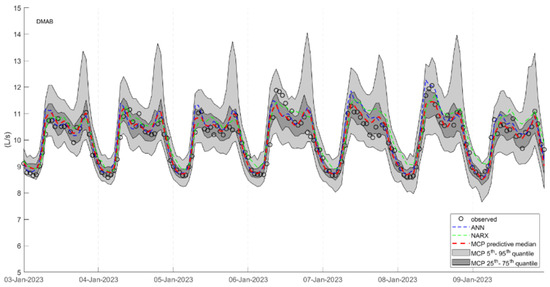 Comparison between observed values and deterministic forecasts (ANN, NARX, MCP median) of water demand for the week starting on 3 January 2023 in the DMAB district. The predictive probability distribution bands provided by MCP are also displayed.