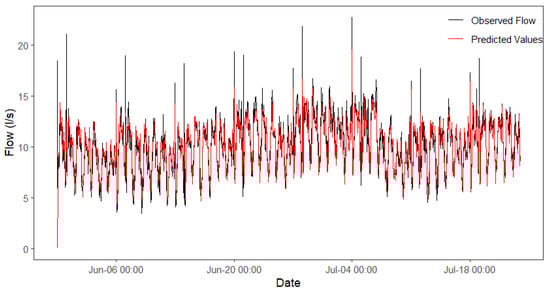 The assessment of various combinations of ARMA parameter orders, coupled with an analysis of residuals, led to the selection of a GARMA(2,0) model. This choice was substantiated by the observed fit of the model to the data, as well as its ability to accurately represent the series’ behavior. Figure 1 illustrates the net flow values (q_net) observed (depicted in black) alongside those adjusted by the model (shown in red) for the DMA A series. This comparison clearly demonstrates the model’s robustness and its effectiveness in capturing the dynamics of the series. The congruence between the observed and model-adjusted values underscores the GARMA model’s aptitude for accurately forecasting water demand.