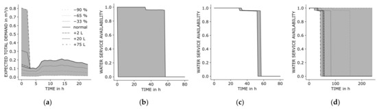 6]. For scenarios (ii), minor stockpiling, (iii), moderate stockpiling, and (iv), severe stockpiling, the stockpiling was assumed to be limited by the water storage capacities available to the users. Therefore, a demand surge to fill these capacities was added to the first hours of the standard load profile. The capacities in scenarios (ii) and (iii) were implemented based on the recommendations for water rations for one day (2 L per person) and ten days (20 L per person), respectively [