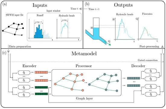 Summary of the process to generate a prediction for one future time step of depths and flow rates. Subsequent predictions are obtained by iteratively repeating this process. (a) shows the inputs: partial time series of runoff and water depths, and system information (topology, node elevation, pipe diameters, and lengths). These data are organized in windows and normalized before entering the artificial neural network. (b) shows the metamodel structure in three stages: Encoder, Processor, and Decoder. The Encoder is a set of two multilayer perceptrons, , that separately computes the embedding of nodes (pictured in pink) and pipes (pictured in green). These embeddings are fed to the graph layer which computes new node embeddings (pictured in gray). The output of this phase is then decoded by the Decoder, a set of two MLPs that transform the processed embeddings into raw predictions of the physical variables, i.e., depth () and flow rate (). These quantities are marked with an asterisk to indicate they have not been post-processed. (c) shows the new predictions of depths and flow rates after being post-processed. Having these values, the process repeats to determine the entire time series. This diagram is adapted from [] to illustrate the modification of the method.