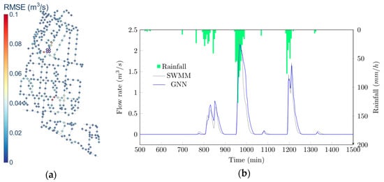 Figure 2 shows the performance of the model for an example rainfall event from the validation set. On the left side of the figure, the colored map indicates the RMSE per node. This map shows that most of the nodes have a low error. There are only a few of them with an RMSE higher than . These results exemplify the high accuracy of the proposed extension of the model.