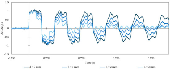 The pressure signal for Q0 = 210 L.h−1 is presented in Figure 1, where ΔH is the pressure difference between the measured and the steady state pressure and ΔHJ is the pressure variation estimated by the Joukowsky formulation, ΔHJ = aU0/g, being a the pressure wave celerity, U0 is the steady state mean velocity in the pipe, and g is the gravitational acceleration. The observed pressure drop due to the leak considerably increases as the leak flow rate increases, to the point where large pressure variations are only observed during the first three periods of time. After that time, the pressure variations are relatively small (+/− 15% ΔHJ), being the remaining variations due to the fluid–structure interaction of the pipe coil.