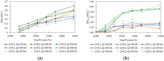 The straight pipe is used to assess the influence of the entrapped air pocket in the pressure signal. An acrylic device has been installed ‘off-line’ in the pipe to simulate an entrapped air pocket. The tested flow rates vary between 50 and 450 L.h−1, being the tested air pocket sizes presented in Table 1. Two experimental sets of tests were carried out, the first focusing on how the air pocket evolves regarding pressure drop, pressure amplitude, wave damping, and wave phase shift, and the second focusing on the influence of the air pocket position in the previously identified features. The air pocket is positioned, X, at a length of 7.855 m (X/L = 52.4%) from the downstream valve for Set I, whereas it is installed at 2.04 m (LOC1, X/L = 13.6%), 7.855 (LOC2, X/L = 52.4%), and 10.265 m (LOC3, X/L = 68.4%) from the downstream valve for Set II. Increasing air pocket volumes in the same location generates higher pressure drops, increases the wave damping, promotes energy dissipation in the air pocket depending on whether the air-water interface remains intact or not, and further increases the wave shift, reducing the pressure wave frequency. The pressure amplitude is shown to increase from no air volume to a volume Vair/Vwater (%) ratio of 0.003%, decreasing from that point on for the tested system [8].