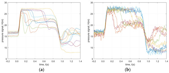 Since the calibrated hydraulic model proved to be reliable, three levels of noise datasets were performed. Figure 2a,b show 10 of the 2400 samples of simulated pressure transient in PT belonging to dataset(1) and dataset(3) with a corresponding low and high level of noise. These figures show the transient signals generated through simulations that include uniformly randomly distributed leaks along the pipe that also vary in magnitude.