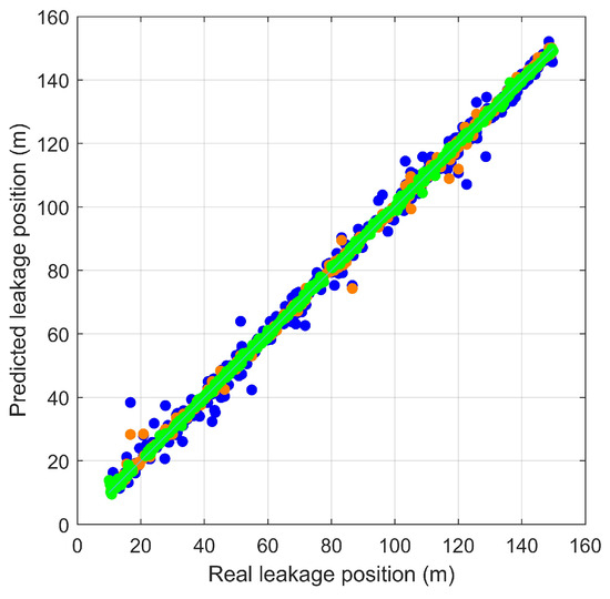 FFNN results as a Q-Q plot of the predicted against real leak positions for the three datasets: dataset(1) in green, dataset(2) in orange, and dataset(3) in blue.