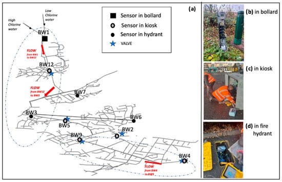 The Bristol Water “Field Lab” is an operational water distribution network, supplying approximately 8000 customer connections in the city of Bristol, UK. Figure 1 shows the locations of the nine MetriNet-Q52 sensors developed by Analytical Technology (ATi) (Manchester, UK), measuring chlorine, pH, temperature, conductivity and colour at rates ranging from 1 sample/sec to 1 sample/15 min, for 2.5 years. There are the following two main flow directions in the distribution system: (i) BW1 to BW3 and (ii) BW4 to BW9. The other locations experience flow mixing. Two sources, with different chlorine concentrations, supply BW1. The network is also equipped with continuous hydraulic sensing.