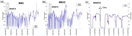 Typical free chlorine data over 6 months from online sensor and DPD, at BW1 (a) and BW12 (b). (c) shows the free chlorine data at BW1 and BW12 over a 4 day period.