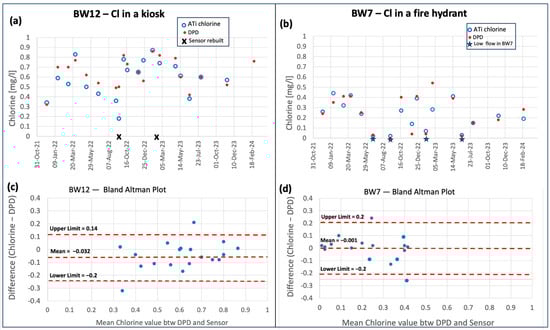 Chlorine from ATi and DPD at BW12 (a) and BW7 (b) for 28 months. (c,d): Bland–Altman plot to compare DPD and ATi measurements of BW12 (c) and BW7 (d).