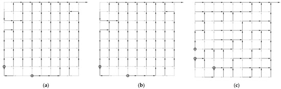 Scheme of the best design of the flattened Chicó Sur benchmark network obtained from three criteria proposed by [3]. (a) Criterion 1; (b) Criterion 2; (c) Criterion 3.