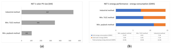 Solar PV sizes and economic performance for NET 1: (a) Solar PV size obtained from the three methods; (b) Results of economic performance of the three methods.