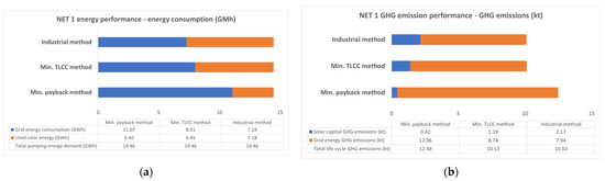 Energy and GHG emission performance of the three methods for NET 1: (a) Results of energy performance; (b) Results of GHG emission performance.